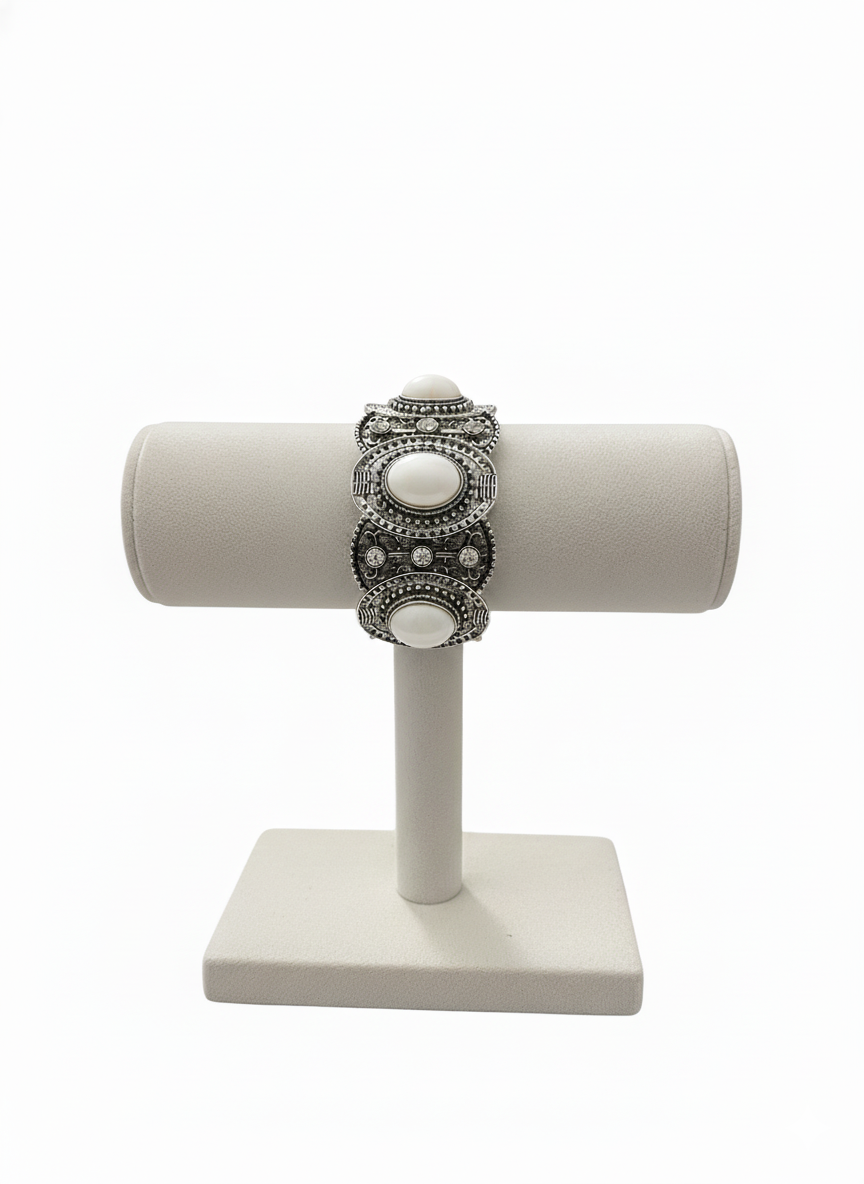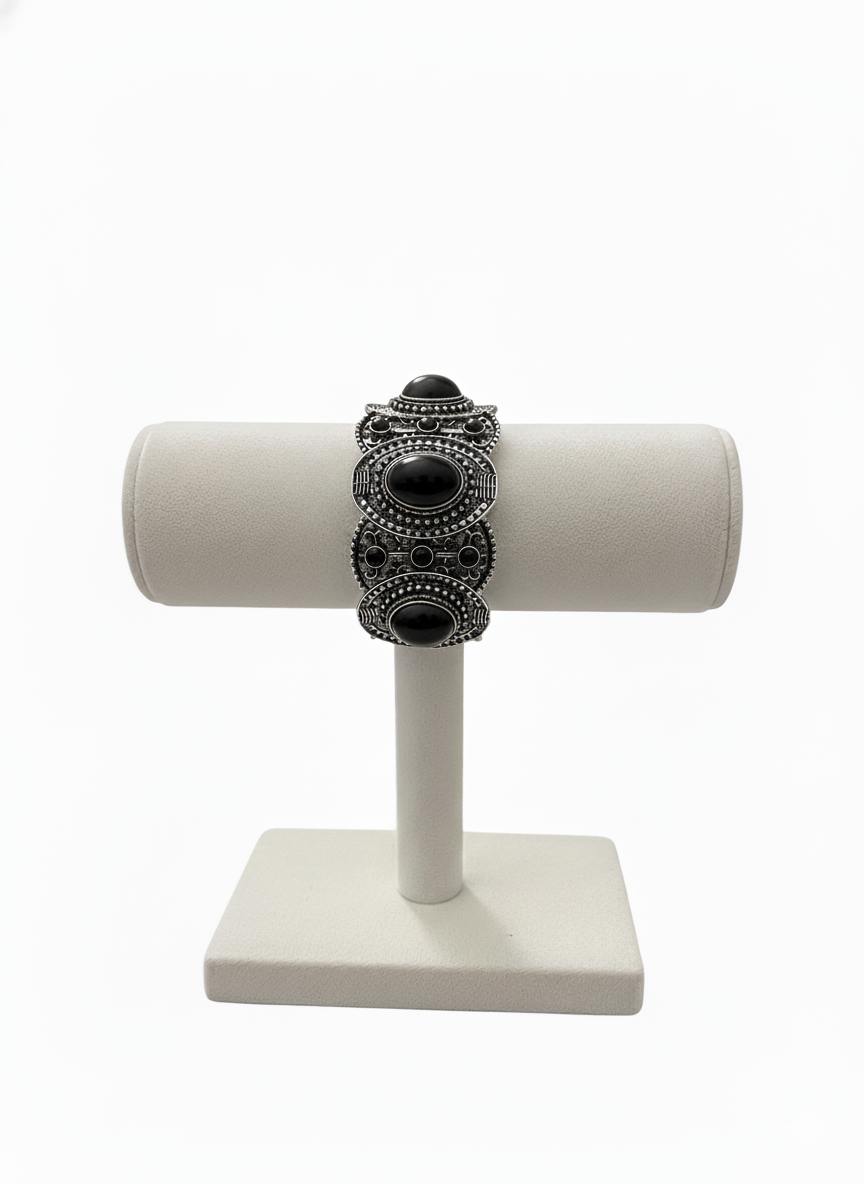 Elevate your look with this stunning Southwestern-inspired statement bracelet from Elegance Outlet, available in your choice of four classic colors. Each bracelet features three large, smooth oval stones—choose from vibrant turquoise, bold red, classic white, or elegant black. The stones are set in an ornate, antique silver-tone frame detailed with intricate beaded patterns. Designed on a comfortable stretch band, this bracelet slides on easily for a perfect fit, making it a go-to accessory for adding a touch of bold, bohemian charm to any outfit